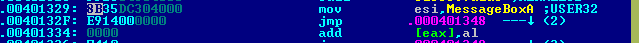 어셈블러 코드를 볼 때 새 jmp 는 코드 아래에서 esi 를 호출 하고 esi 는 MessageBox 함수 주소 대신 가비지를 포함한다는 것을 알 수 있습니다. 주소 401330을 건너뛰고 있으므로 mov esi, ds: MessageBox를 건너뜁니다. 따라서 esi 는 초기화되지 않으며 응용 프로그램은 401366에서 충돌합니다.