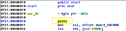 pusha 명령 은 범용 레지스터를 스택에 저장합니다. 결국 저장된 레지스터 값을 푸시하는 popa 명령이 있어야 합니다. popa 명령 뒤에는 원래 진입점에 대한 jmp 가 있습니다 . Alt + T 를 누르고 popa 명령 을 찾아 텍스트 검색 옵션을 사용할 수 있습니다 .