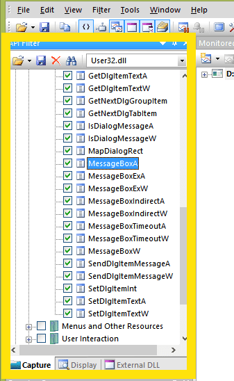 API Monitor에서 File > Monitor New Process 를 선택 하고 파일 경로를 설정합니다. 프로세스를 실행하면 호출된 함수 목록이 표시됩니다. MessageBox를 찾아 보겠습니다.