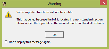 스크린샷 17에서 읽을 수 있는 코드, 감지된 기능 및 가져오기 테이블이 있음을 알 수 있습니다(스크린샷 18). 이 시점에서 애플리케이션을 실행하고 IDA Pro에서 디버그할 수 있습니다. 디스어셈블러에서 디버거 > 디버거 선택 > 로컬 Win32 디버거 를 선택한 다음 F9 키를 누릅니다 . 그 후 다음과 같은 경고 메시지가 나타납니다.