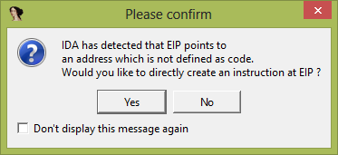 이 메시지는 우리가 가고자 하는 지점에 코드가 없다는 것을 의미합니다. 따라서 IDA는 EIP(Extended Instruction Pointer)가 가리키는 바이트를 기반으로 디스어셈블된 목록에 명령을 생성합니다.