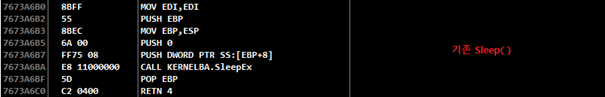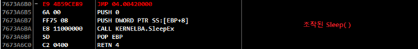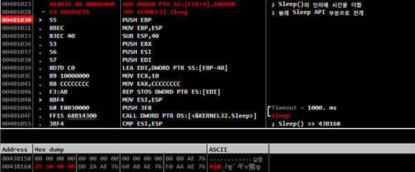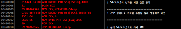 Sleep() 함수의 원래 주소 7673A6B0의 명령어를 JMP 명령어로 변경한 것을 확인할 수 있다. 이렇게 변경된 Sleep()함수는 호출될 때마다 해당 부분으로 이동하게 되며 공격자가 의도한 대로 흐름이 변경될 것이다. 필자가 의도한 조작은 아래 그림과 같이 Sleep() 함수의 시간 값을 증가시킨 다음, 원래대로 코드를 복원하고 복원된 지점으로 이동하는 것이다.