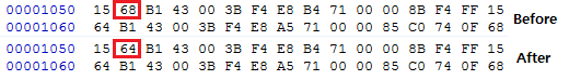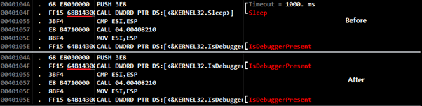 만약 (A)에 존재하고 있는 값인 43B168을 다른 값으로 바꾸면 어떻게 될까? 직접 Sleep 함수를 호출하는 부분에 IsDebuggerPresent API의 IAT 주소를 넣어보자. 주소는 위 그림에서와 같이 Offset 39164이므로 이는 RVA 43B164가 된다. 이제 아래와 같이 코드를 패치해보자.