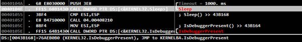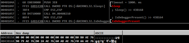 원래 Sleep()을 호출하던 부분에 IsDebuggerPresent()의 IAT 주소로 변경을 해주었다. 그렇다면 이제 위에서 언급한 바와 같이 PE 로더가 0x40104F에서 호출하는 함수의 주소를 0x43B164에서 참조하기 때문에 아래의 그림처럼 IsDebuggerPresent()가 위치하게 된다.