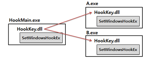 만약 해당 API를 구현하는 HookKey.dll이 존재하며 이를 실행하기 위한 HookMain.exe를 제작하였다고 가정하자. HookMain.exe를 실행하면 HookKey.dll이 해당 프로세스에 로드되며 SetWindowsHookEx()가 호출된다. 이렇게 메시지 후킹이 걸린 상태에서, 다른 프로세스가 해당 이벤트를 발생시킨다면 HookKey.dll은 그 프로세스에서도 로딩이 된다.