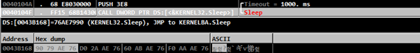 Sleep()를 호출할 때 직접 호출하지 않고 0x43B168 주소에 있는 값을 가져와서 호출한다. 0x43B168 주소는 해당 프로그램의 IAT 메모리 영역으로 0x76AE7990이라는 값이 존재하고 있다. 이제 이 값이 바로 해당 프로세스 메모리에 로딩된 Kernel32.dll의 Sleep 함수의 주소이다.