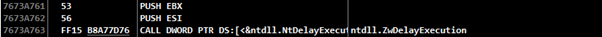 특히 (C)의 방식은 Ntdll.dll의 함수도 조작이 가능하다. 아래의 그림을 보면 실제 Ntdll.ZwDelayExecution을 호출하는 것을 확인할 수 있으며, 해당 부분의 실제 코드의 5 바이트를 JMP 명령어로 수정하여 원하는 후킹을 진행할 수가 있다.