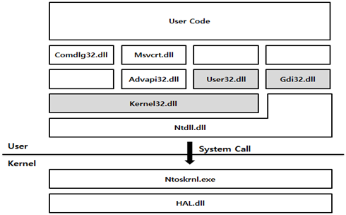 실제 응용프로그램 코드를 실행하기 위해서는 많은 DLL이 로딩된다. 모든 프로세스는 기본적으로 kernel32.dll이 로딩되며, kernel32.dll은 ntdll.dll을 로딩한다. 바로 이 ntdll.dll의 역할이 사용자 모드에서 커널 모드로 요청하는 작업을 수행한다. 이러한 방식을 통해 시스템 자원에 접근할 수 있게 되는 것이다.