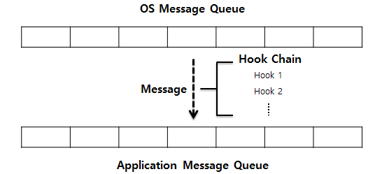 아래 그림을 보면 메시지 후킹이 어떤 지점에서 이루어지는지 나타낸 것이다. 사용자가 어떠한 행위를 했을 때 이벤트가 발생되고, 이벤트 발생으로 인해 OS에서 응용프로그램으로 보낼 메시지들이 OS Message Queue에 존재하고 있다. 예를 들어 키보드 입력 이벤트가 발생하면 WM_KEYDOWN 메시지가 OS Message Queue에 추가된다. 운영체제는 해당 이벤트가 어느 응용프로그램에서 발생했는지 파악한 다음, 큐에서 메시지를 꺼내어 해당 응용프로그램의 메시지 큐에 전달한다. 해당 응용프로그램은 자신의 Application Message Queue에 WM_KEYDOWN 메시지가 추가된 것을 확인하고 해당 이벤트 핸들러를 호출한다. 이러한 방식으로 윈도우는 메시지를 전달한다.