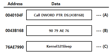 그렇다면 왜 0x40104F에서는 CALL 0x76AE7990이라 하지 않고 다른 곳을 참조하는 하여 접근하는 것일까? 이는 운영체제 버전이나, 어떤 언어, 서비스 팩이냐에 따라DLL의 버전이 다르며, 해당 함수의 위치가 달라지기 때문이다. 모든 환경에서 Sleep() 함수 호출을 보장하기 위해 컴파일러는 Sleep()의 실제 주소가 저장될 위치(0x43B168)를 준비하고 CALL DWORD PTR DS:[43B168]을 적어두기만 한다. 그 후 파일이 실행되는 순간 PE Loader가 0x43B168 위치에 Sleep() 함수의 주소를 입력해준다.