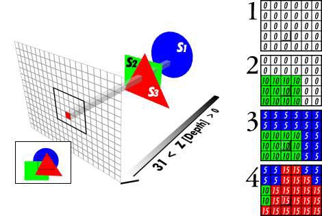 어떤 물체가 그려질 때 만들어진 픽셀의 깊이 정보(z 좌표)는 버퍼(Z 버퍼 혹은 깊이 버퍼)에 저장된다. 이 버퍼는 (x-y)의 2차원 좌표를 기준으로 해당하는 각각의 스크린 픽셀 요소들로 정렬되어 있다. 만약 다른 물체가 같은 픽셀에 그려져야 할 때, Z 버퍼링은 현재 픽셀과 새로 그려질 픽셀 중 어떤 것이 관찰자에게 더 가까운지 깊이를 비교한다. Z 버퍼에 기록되도록 새로 선택된 깊이는 이전의 깊이를 덮어쓴다. 즉, Z 버퍼는 ‘더 가까운 물체가 더 먼 물체를 가린다’ 라는 직관적 깊이 관념을 정확하게 따를 수 있게 돕는다. (https://ko.wikipedia.org/wiki/Z_버퍼링)
