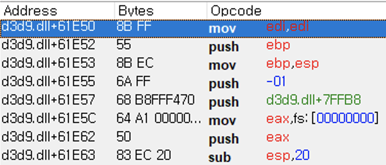 여기서 vtable이란 C++ 클래스의 멤버 함수 중 가상 함수가 존재하는 경우 생성되는 함수 포인터 배열이다. 이 글에서는 IDirect3DDevice9 인터페이스의 vtable에 렌더링 함수들이 정해진 순서대로 존재한다는 것만 알면 된다. 따라서 vtable 주소만 구하면 모든 가상 함수의 주소를 알 수 있게 된다.