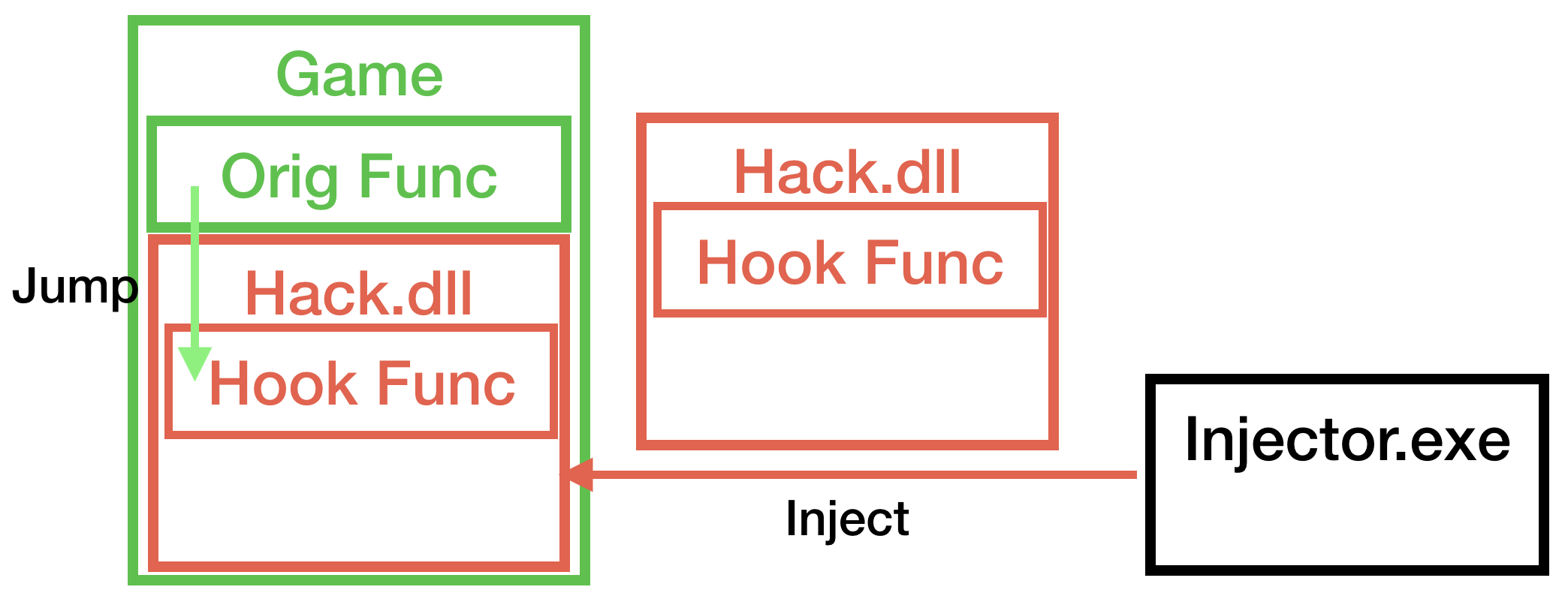 DLL Injection 없이 외부 프로세스에서 메모리 관련 WIN API를 사용하는 방식(External Hook이라고도 함)으로도 월핵 구현이 가능하지만 보통 개발이 편한 DLL Injection을 사용한다. 다만, 해당 내용에 대해 이번 글에서는 그림으로 간략하게 표현하고 자세히 다루지 않는다.